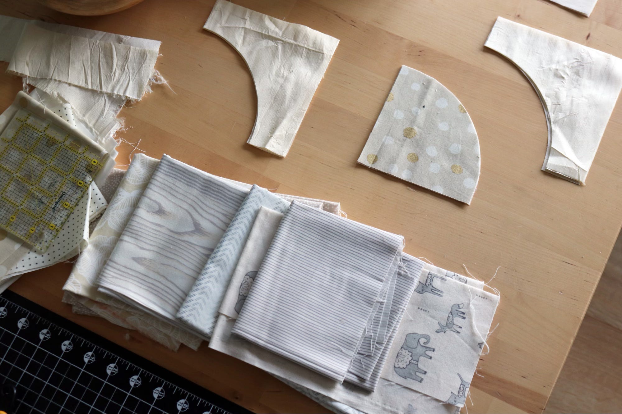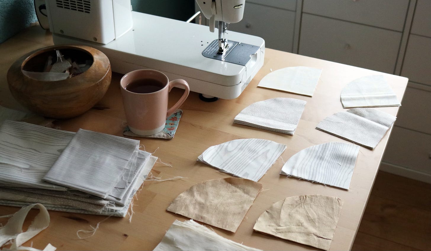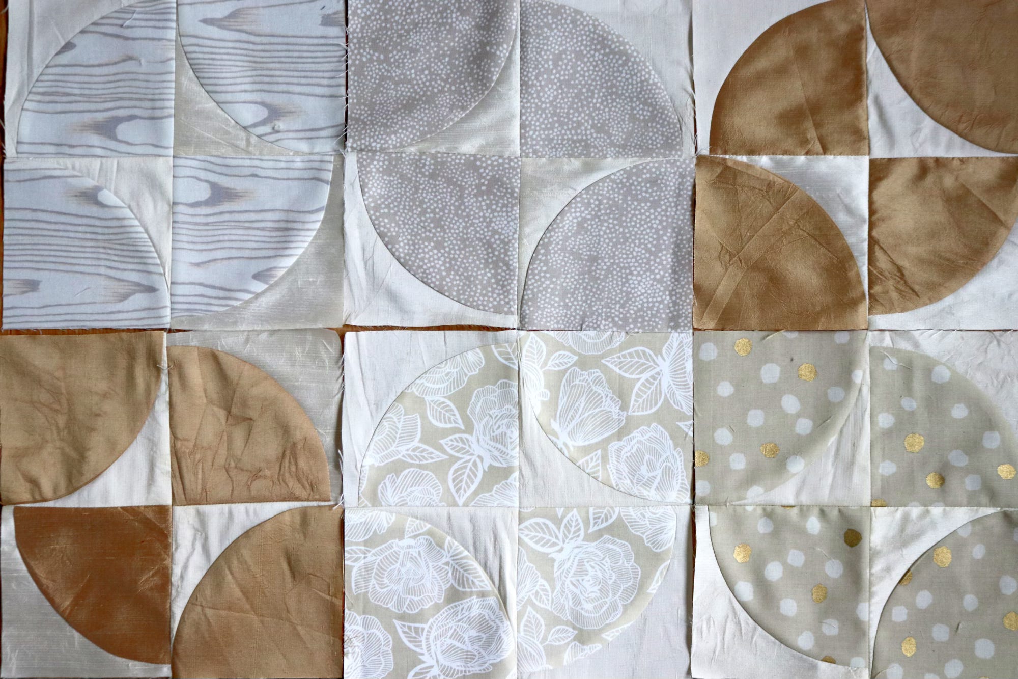 In addition to the cream and pale brown silk, I will be using a variety of simple neutral fabrics. Here are some possibilities. Hmmm. It’s hard to tell at this point what is too similar to the cream silk background fabric and what is just right. When sewing an all-neutral quilt, little variations in hue stand out more than you would expect.