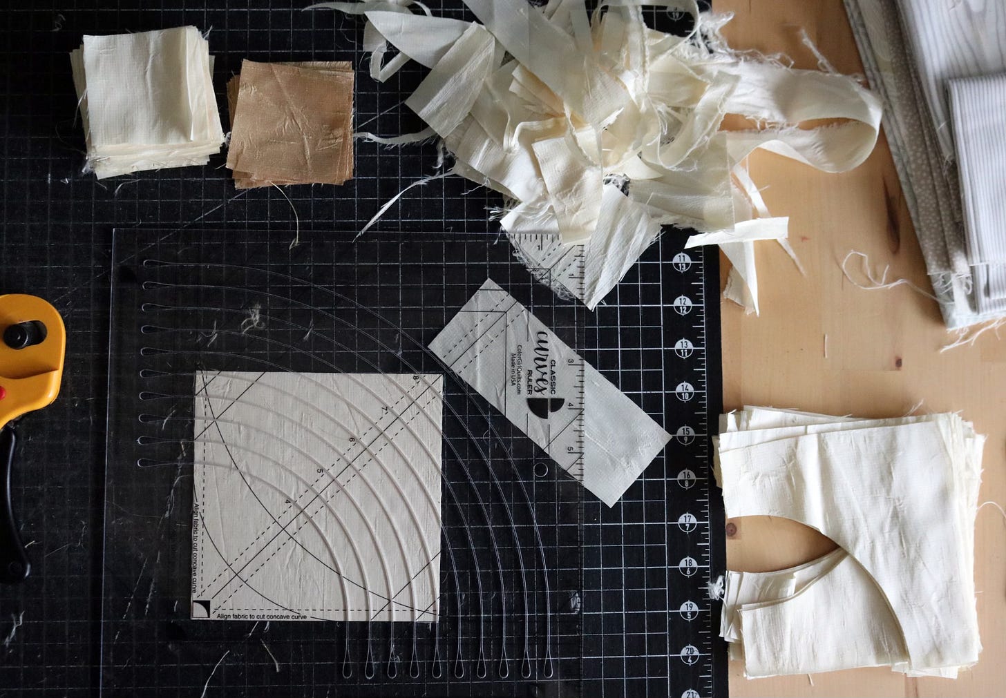 By the way, I am cutting the curves for this block using the Classic Curves ruler (available in Europe at Nanno Creative and in the USA on Amazon). This ruler allows one to cut a variety of drunkard’s path block sizes, which just so happens to be the building block for my Hourglass Curves. It’s not my favorite ruler ever, but it’s doing the job. I wanted a 4” finished drunkard’s path block, and this was already in my ruler stash.