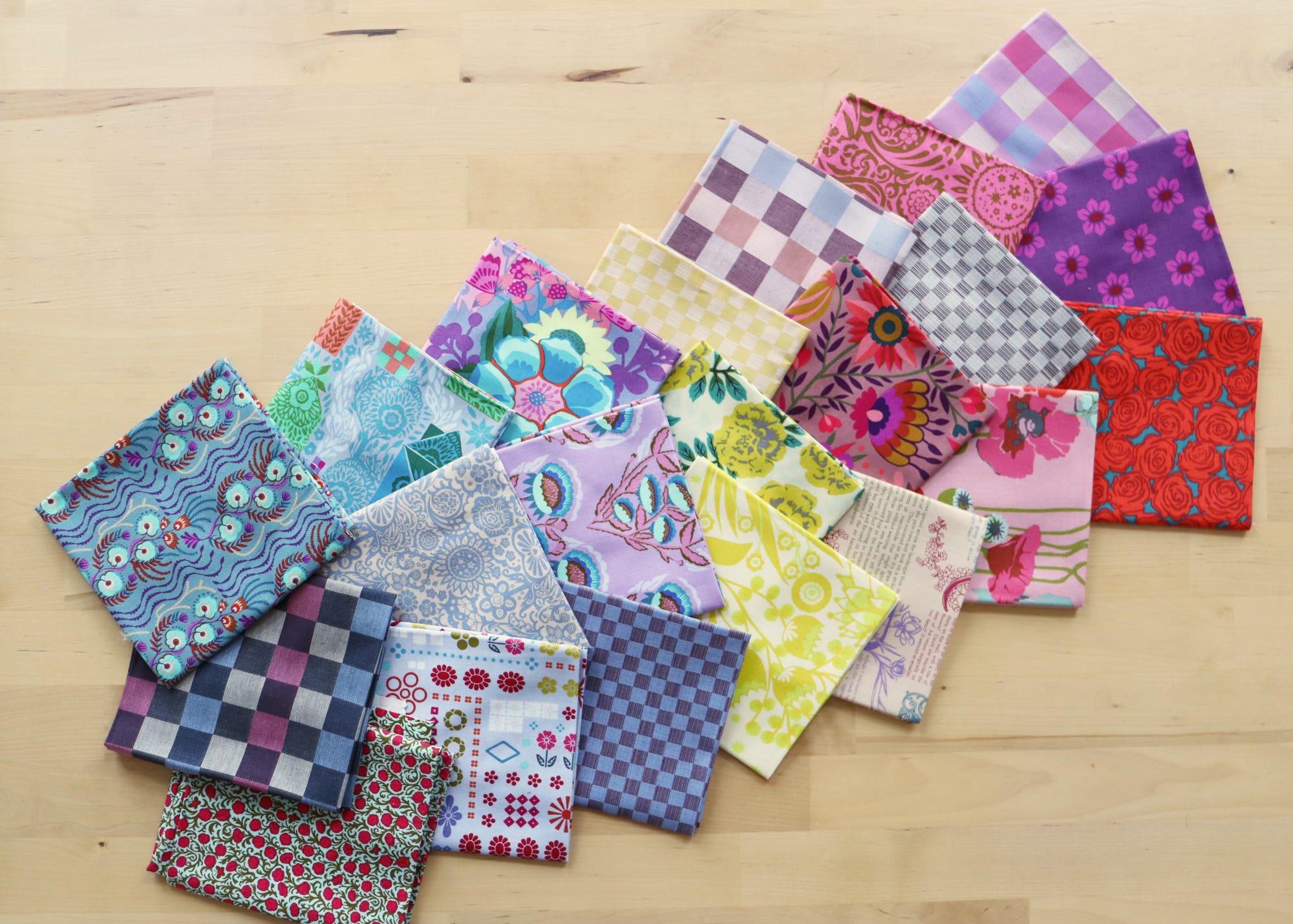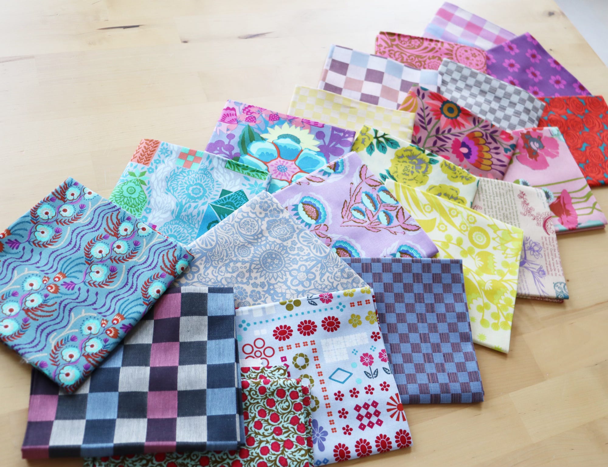 This is a fat quarter set that mixes fabrics from a variety of current collections: Allegory, Overdressed, Check Mate and her daughter’s collection, Yesterday. I chose the Vintage palette, which has softer, more muted colors than the other two options. But it was SO hard to choose! The other two palettes are also amazing.