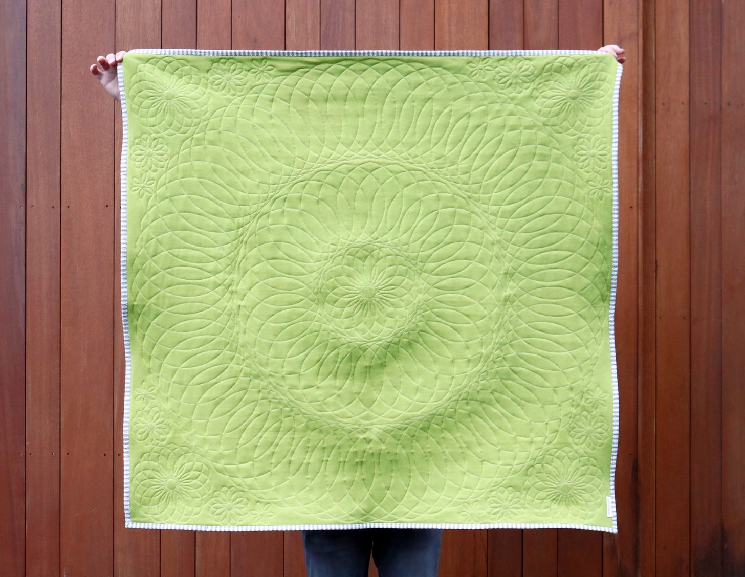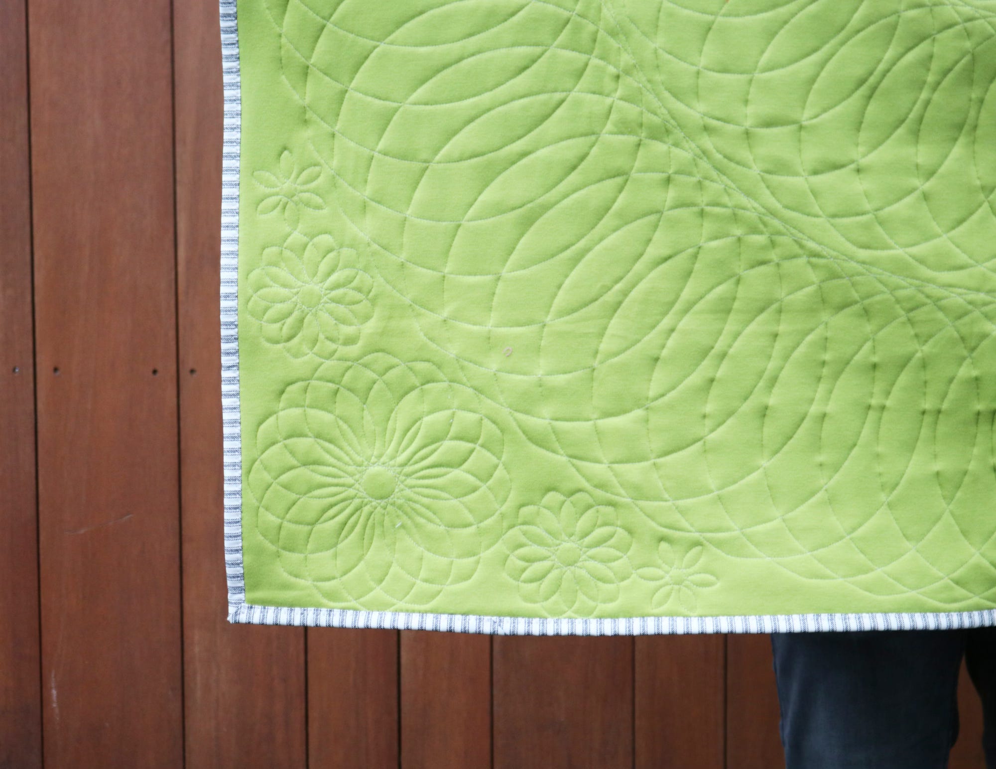 I quilted this piece with a spirograph pattern that beautifully emphasizes the circular rainbow arrangement of the plusses and sets flowers in all four corners.