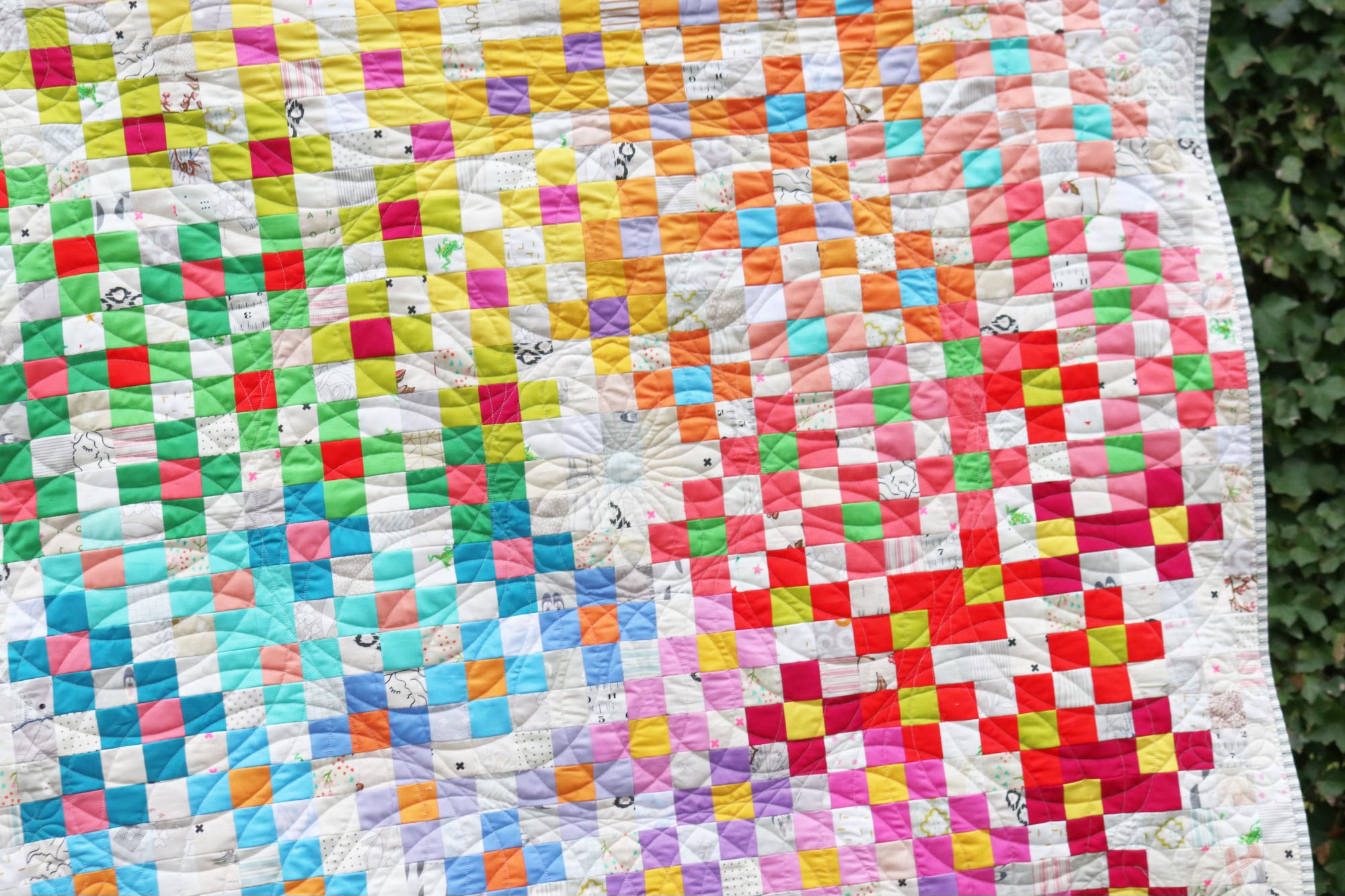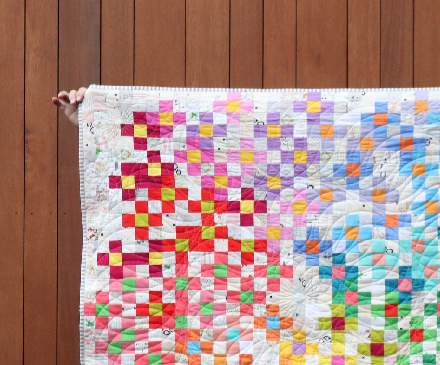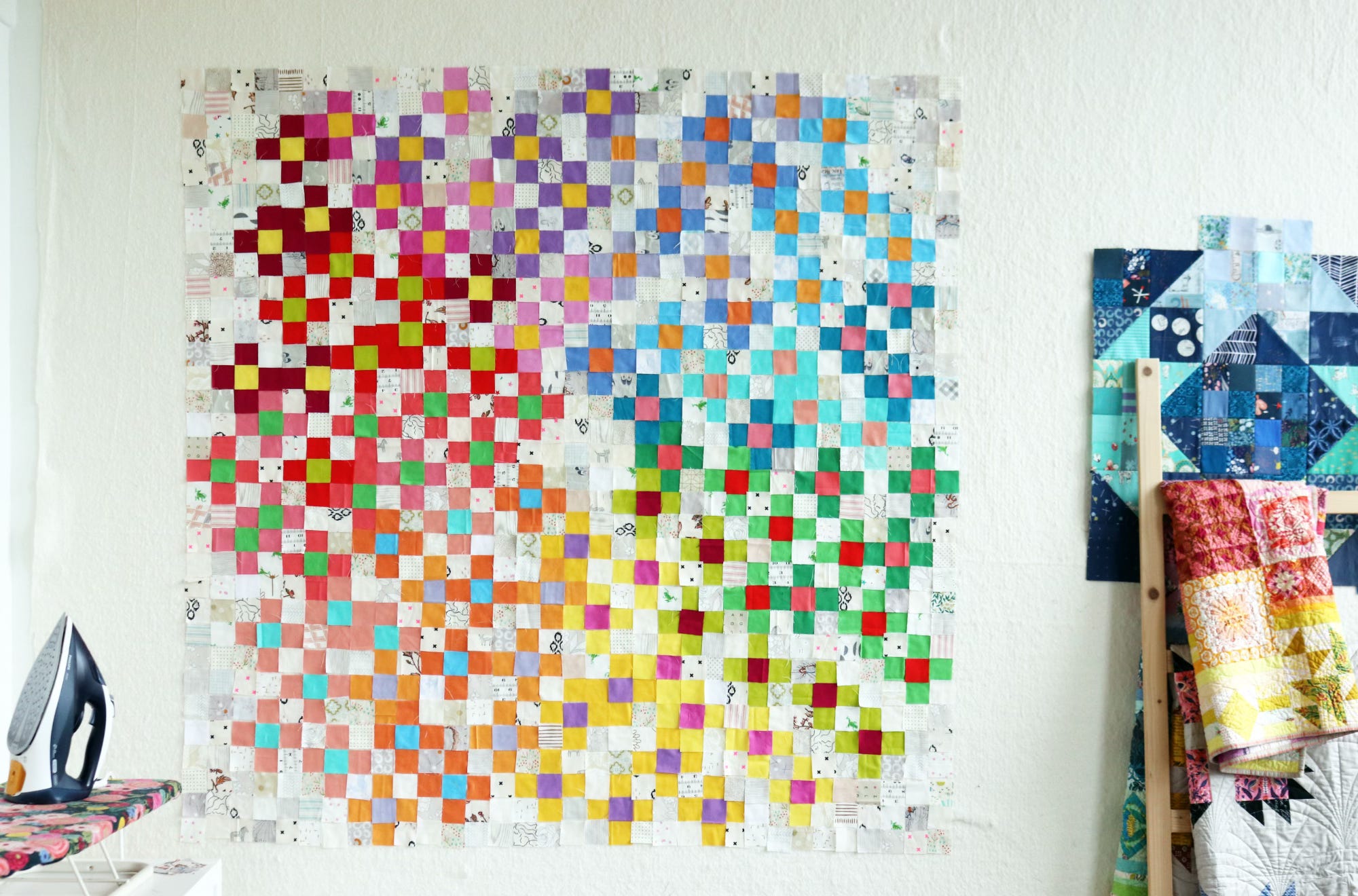 Today’s version of this quilt utilized scraps for the background, transforming the rainbows into an array of solids. If your fabrics stash is short on rainbow hues, you can buy a collection of 19 solids and sew your rainbow this way (creating rainbow scraps for the future, I’d like to point out). The pattern details the brand names for two perfect solid arrays: Ruby + Bee Solids (see baby quilt above) or Art Gallery Solids (see mockup below).