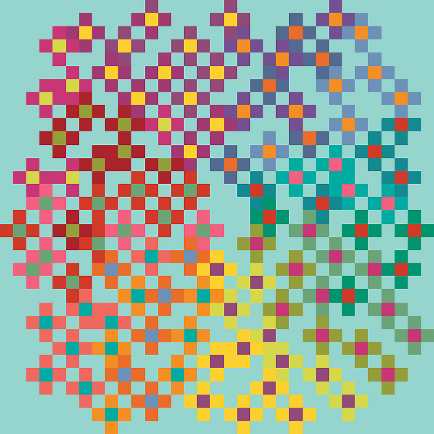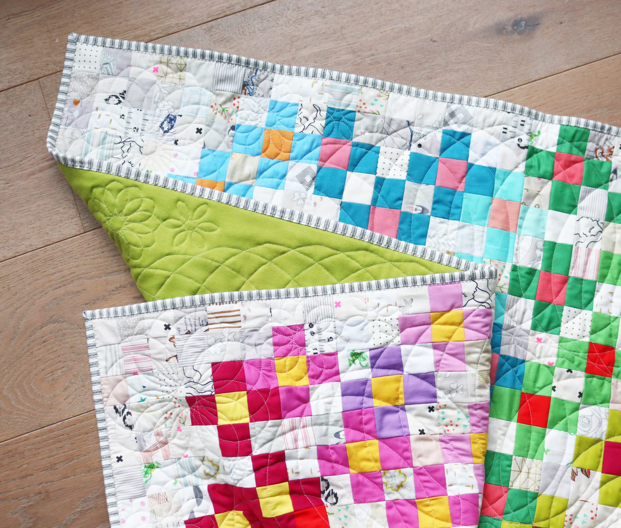 Isn’t it intriguing how these rainbows look on different backgrounds? Above is Art Gallery Fresh Water, mocked up in the baby size version. You could do almost any color solid with scrappy plusses or a scrappy background featuring one color, combined with solid plusses. Choices, choices!