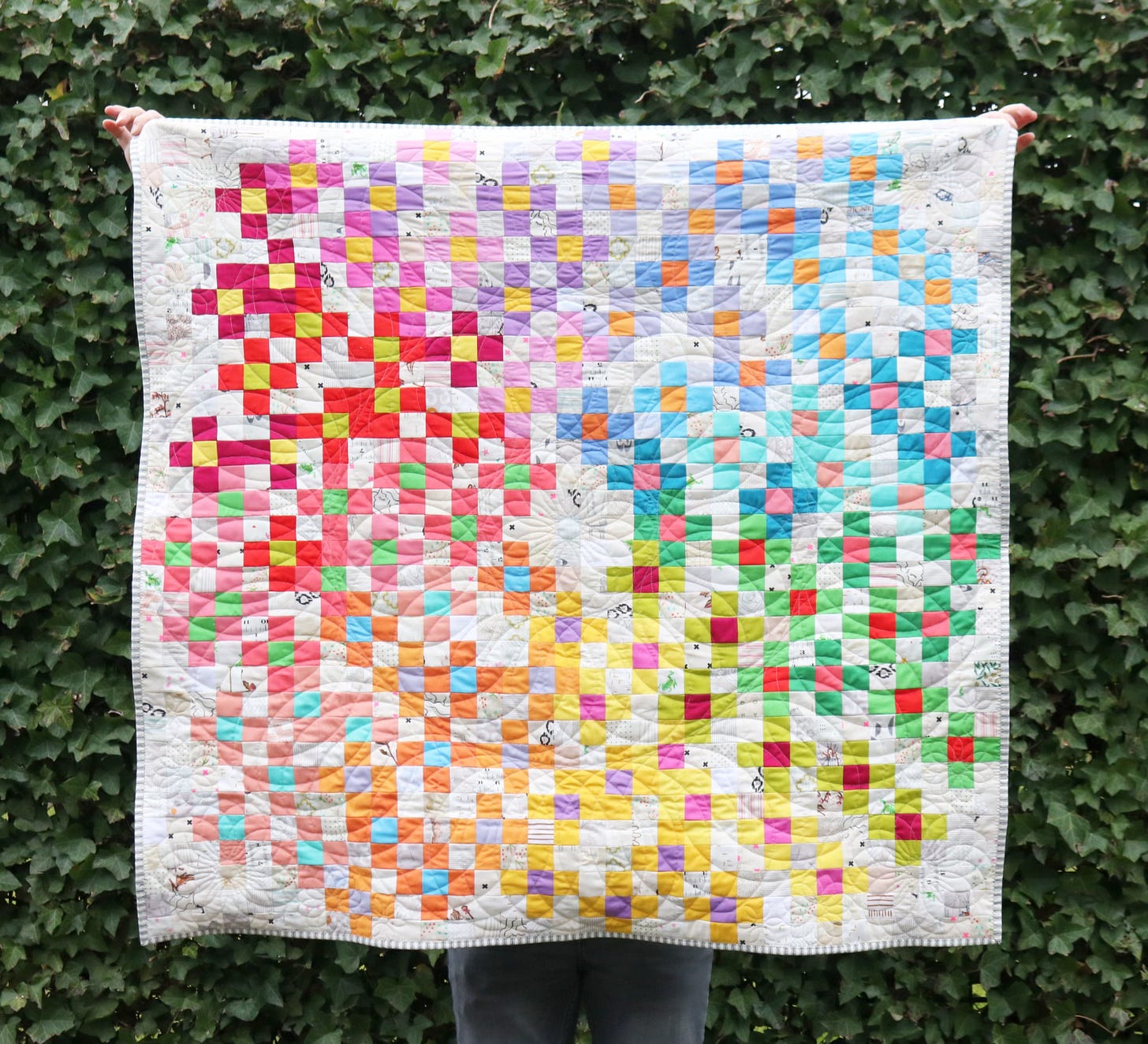 Hurrah, for another Rainbow Over Head! This sweet-sized quilt would be perfect for that baby or toddler in your life OR to hang up on a wall where you sew. She’s 41” square and 100% made with love and light.