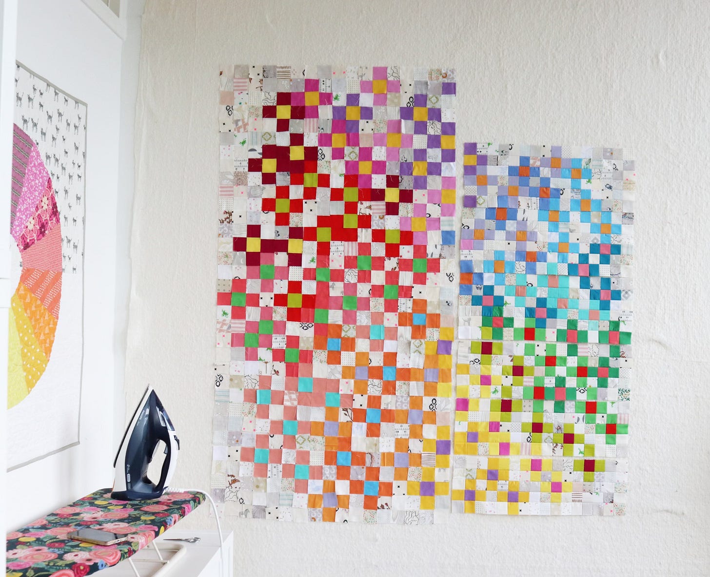 Check out this moment on my design wall. Isn’t it surprising how much patchwork “shrinks” when sewn together? I snapped this photo when only the right side was (mostly) assembled. What a transformation!