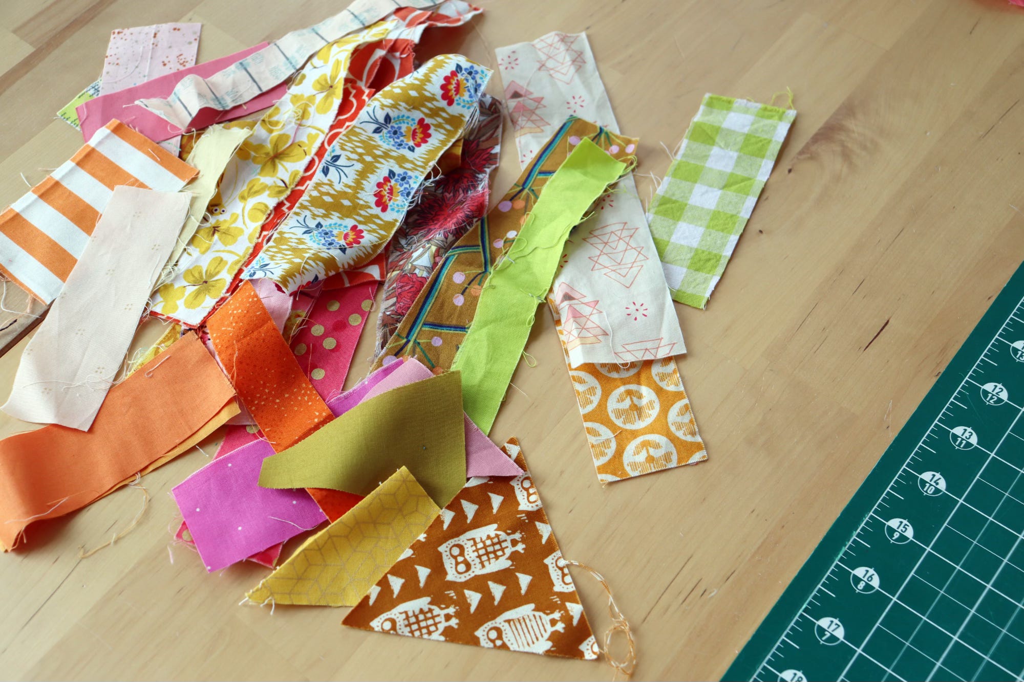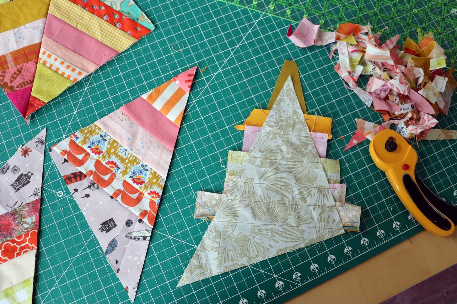 Just as with string blocks, you want to press after sewing each string scrap onto the fabric foundation. If you work on all the foundations at once, adding a strip to each at a time, then it’s not as much back and forth from the sewing machine to the pressing board.