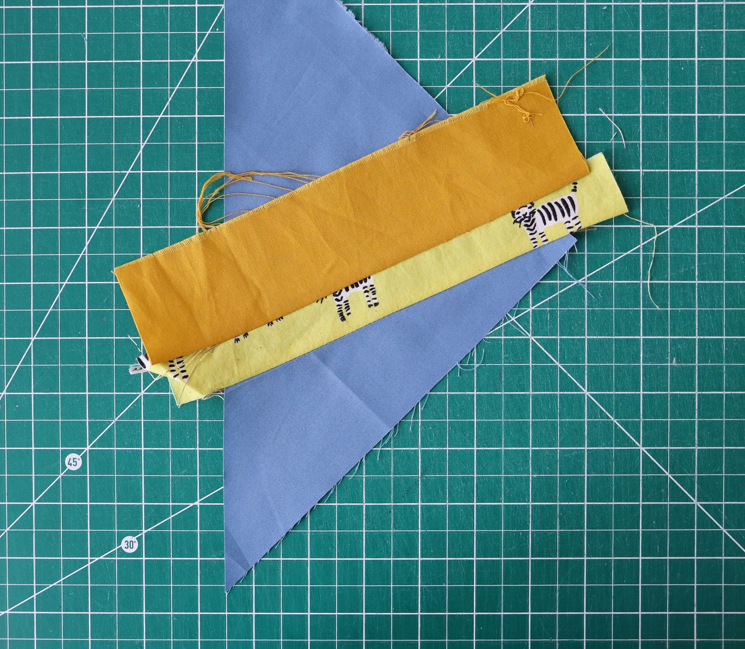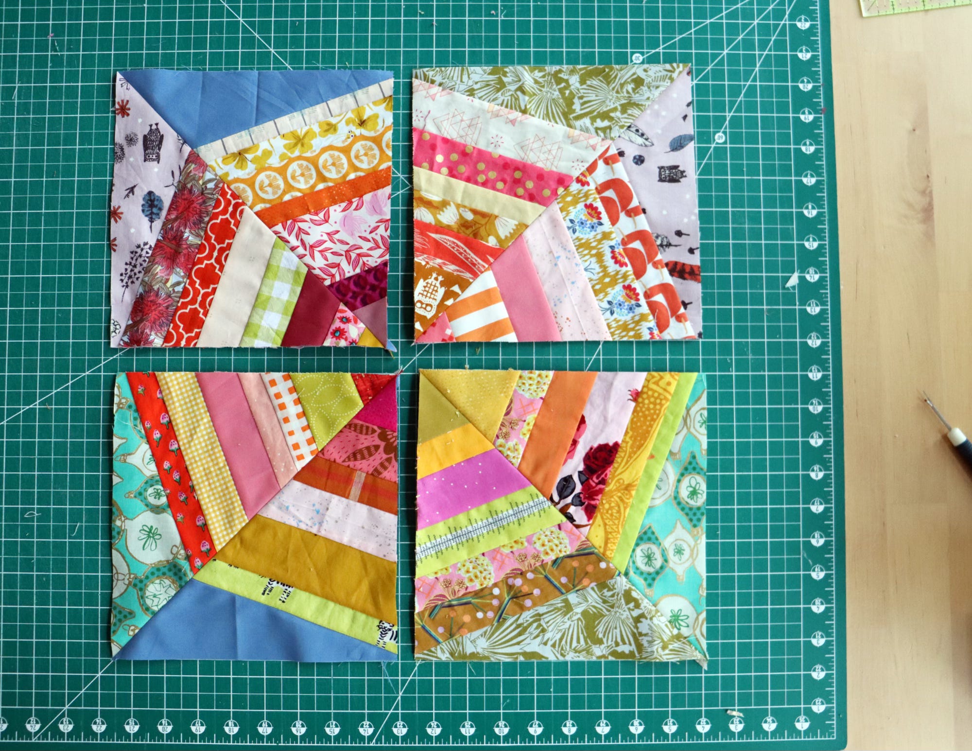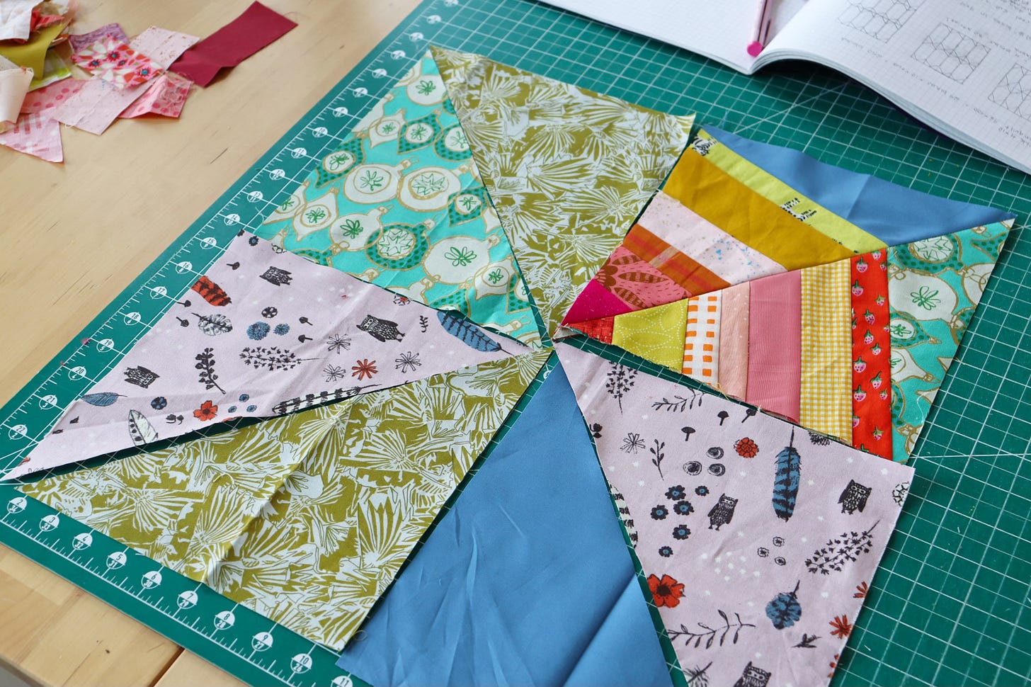 First I made a test quadrant, to check that everything went as planned. Then I cut cool-colored fabric foundations for the rest of my block.
