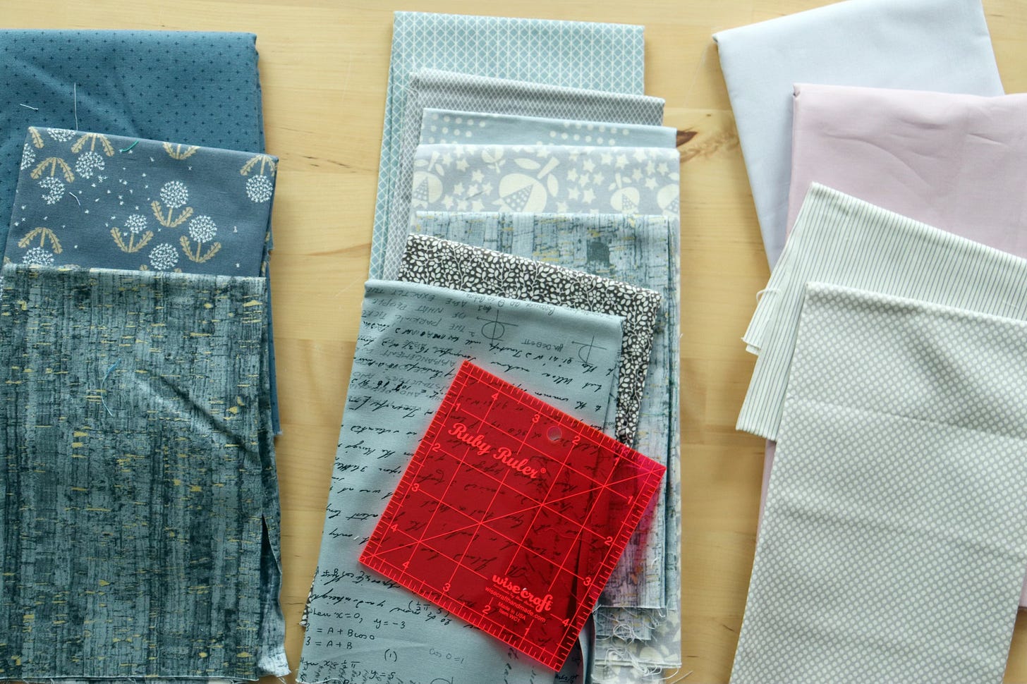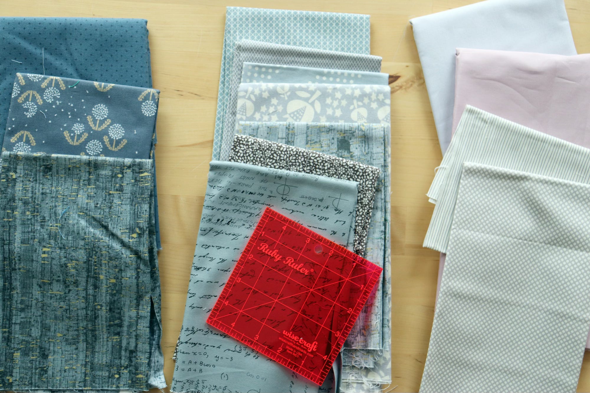 The Ruby Ruler helped me sort my grays into dark, medium and light values. Many of the prints have white elements, which can be challenging for value sorting. The Ruby Ruler does help, but there’s still a sense that some fabrics are hard to categorize. In the end I decided to exclude the floral print in the medium value stack (second from the bottom), as it falls in between dark and medium value.