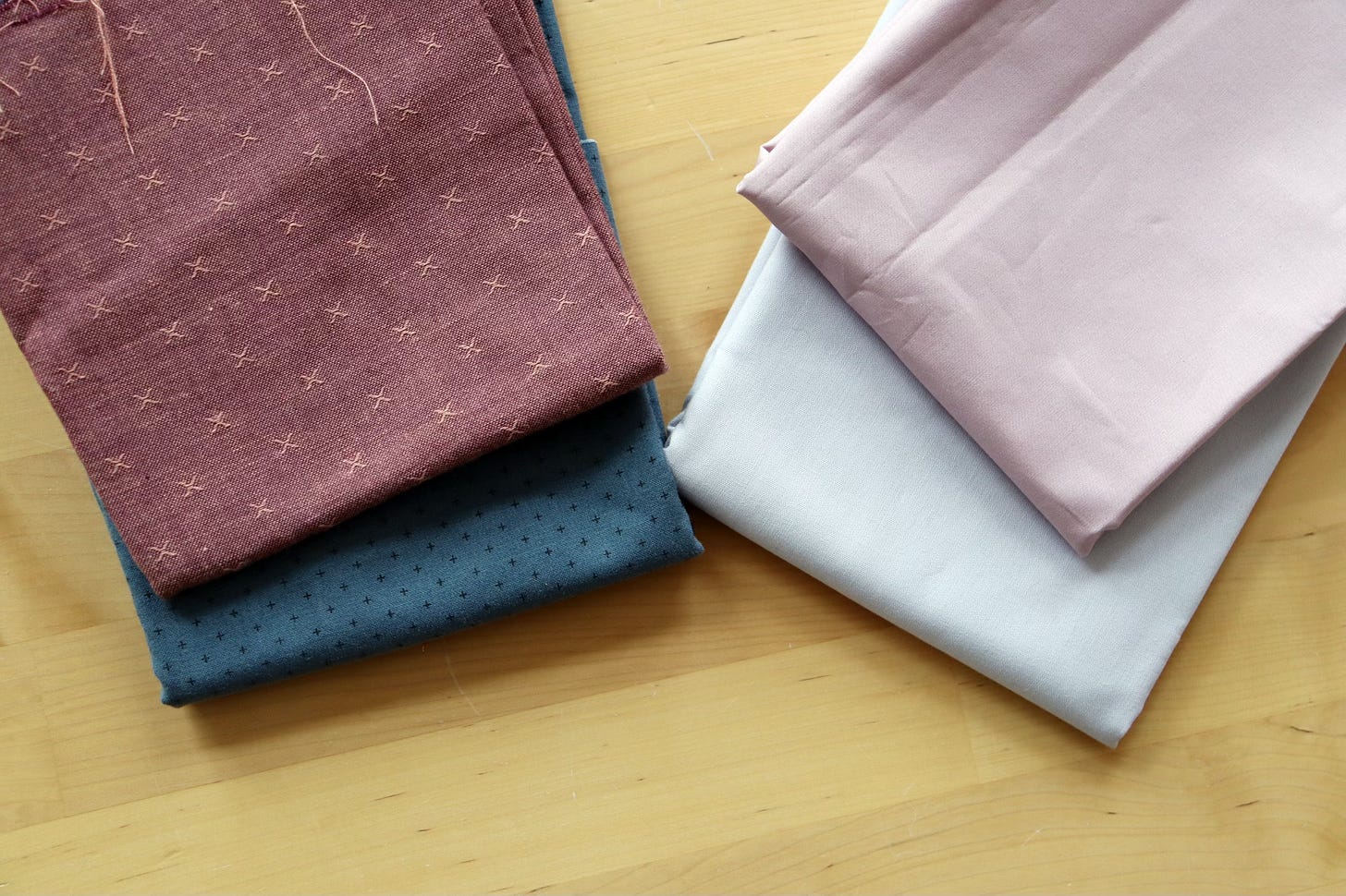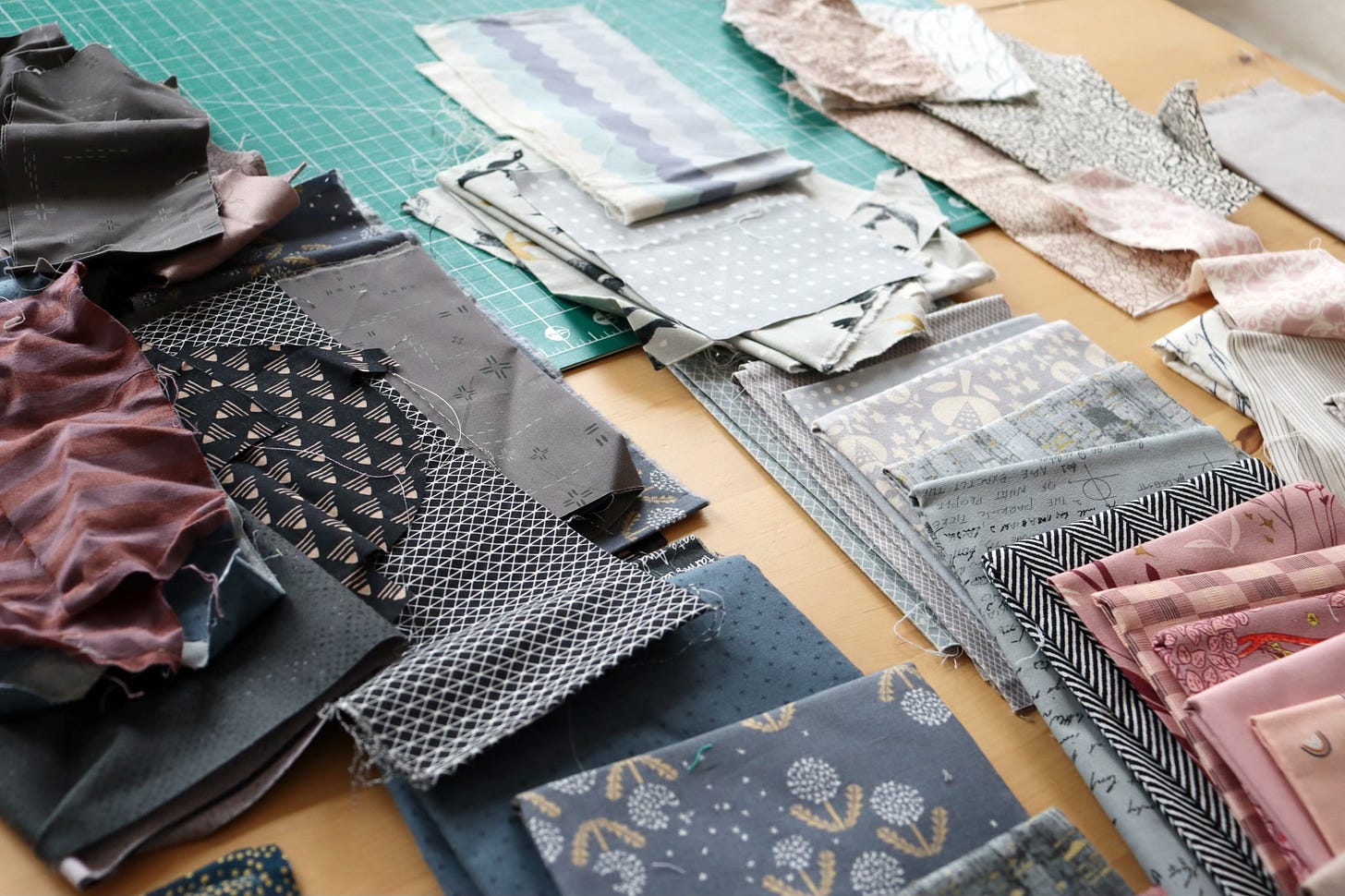 I didn’t have so many fabrics that fit the somber vibe (surprise, surprise), so I widened my palette to include a charcoal black and a purple-brown in the dark value pile. To the medium value pile I added a black/white herringbone, several mauve prints with brown undertones, an unsaturated peach and a soft brown to the original gray fabrics. Now I feel like I may have enough subtle variations to make this interesting for me. Am I already cheating? ;)