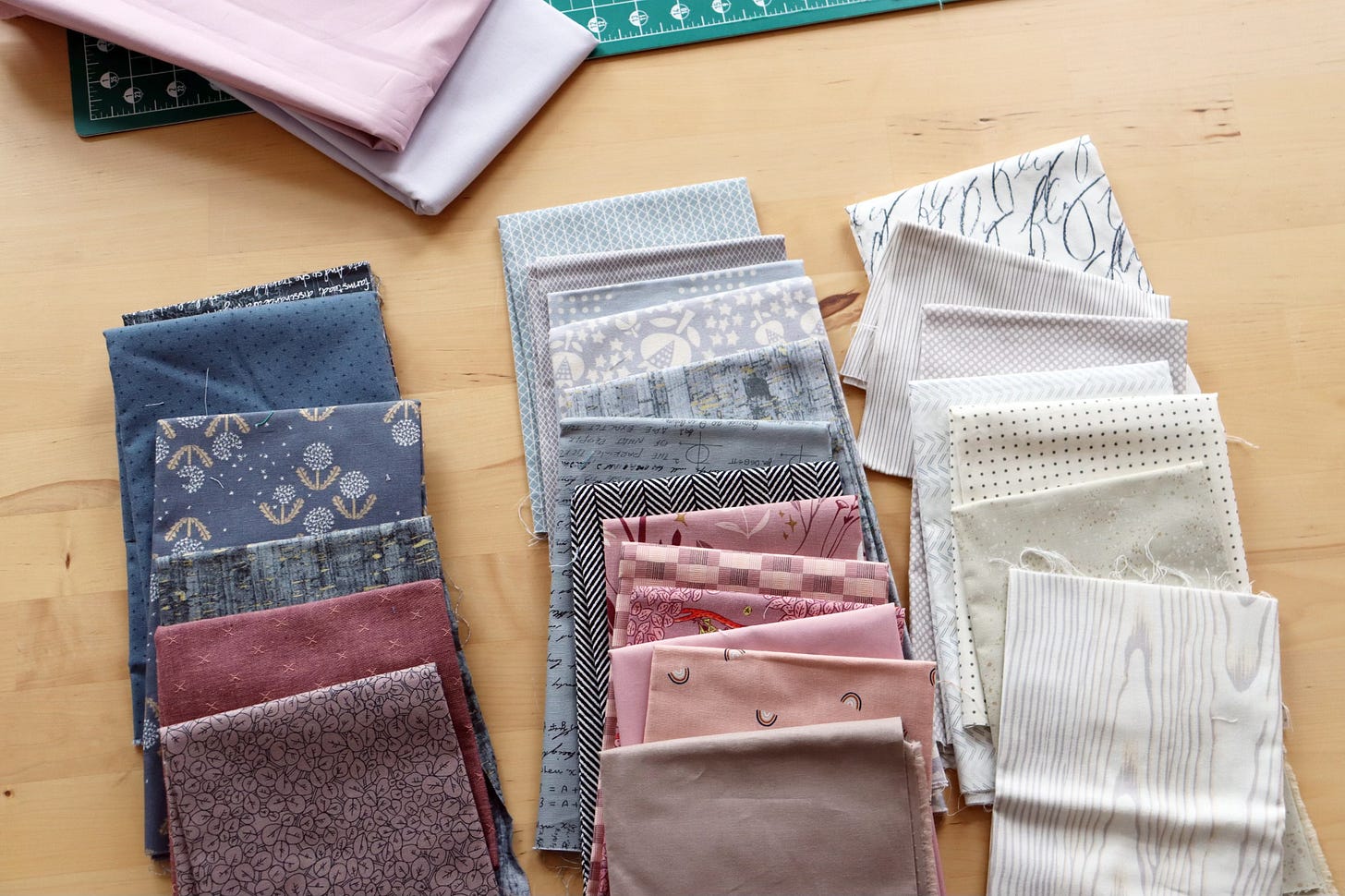 I started with the idea of gray + hints of desaturated purples. I’m focusing on grays with a neutral or blue tint, and excluding the green grays because they feel less somber. The two solids at top right are my idea for the solid elements of the Tapestry Garden quilt. One is a pale gray-lilac and the other is a pale mauve.