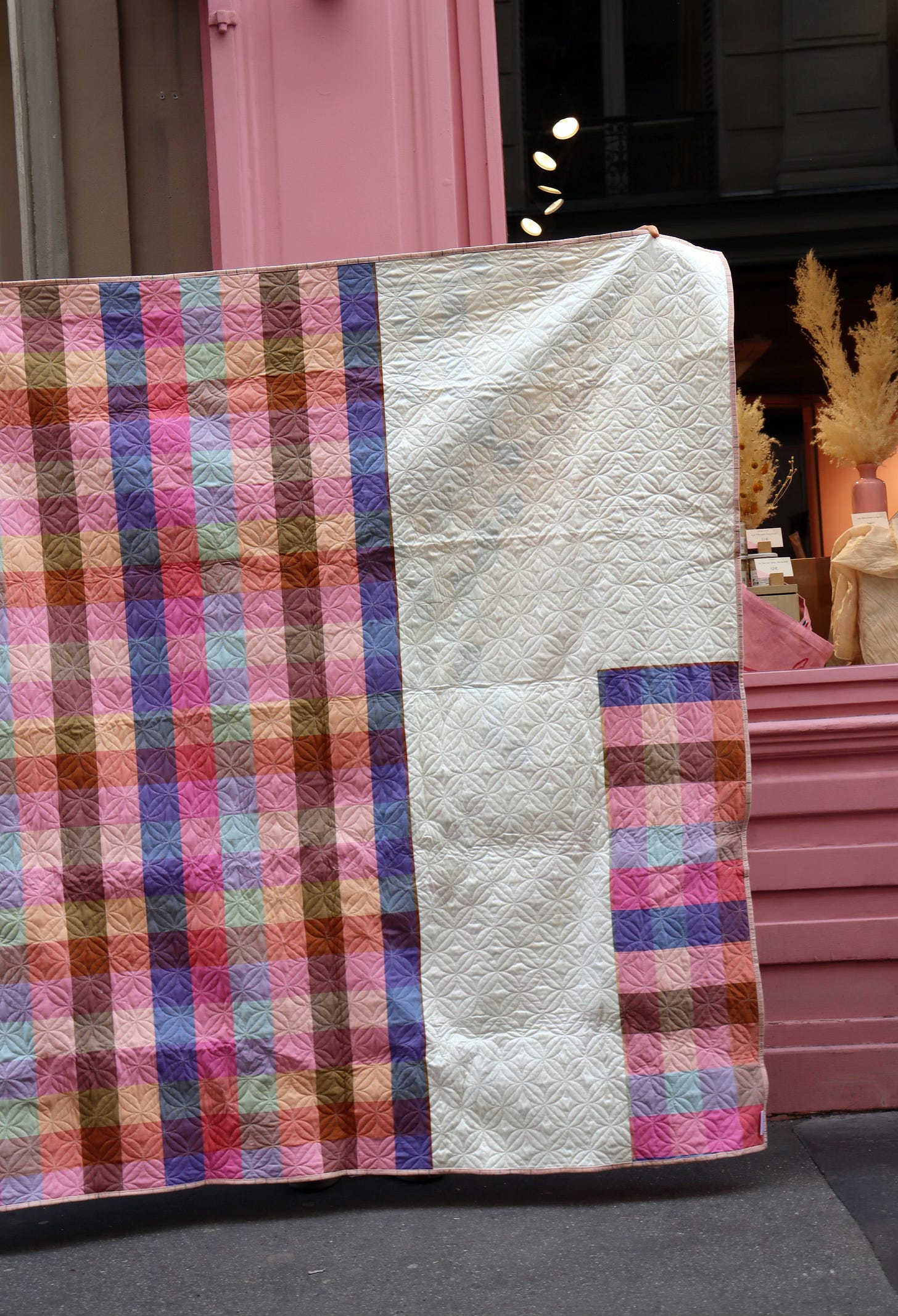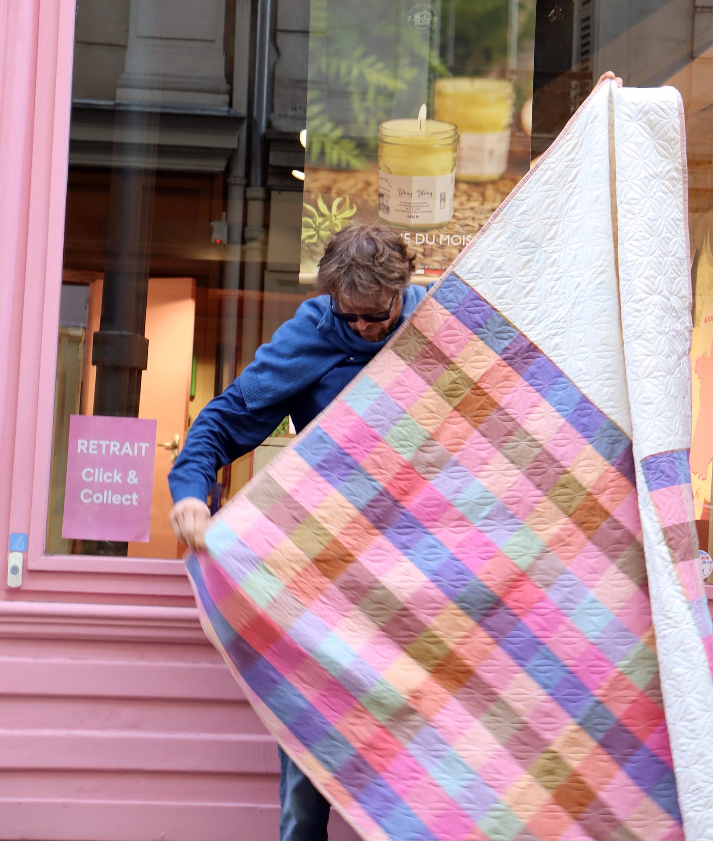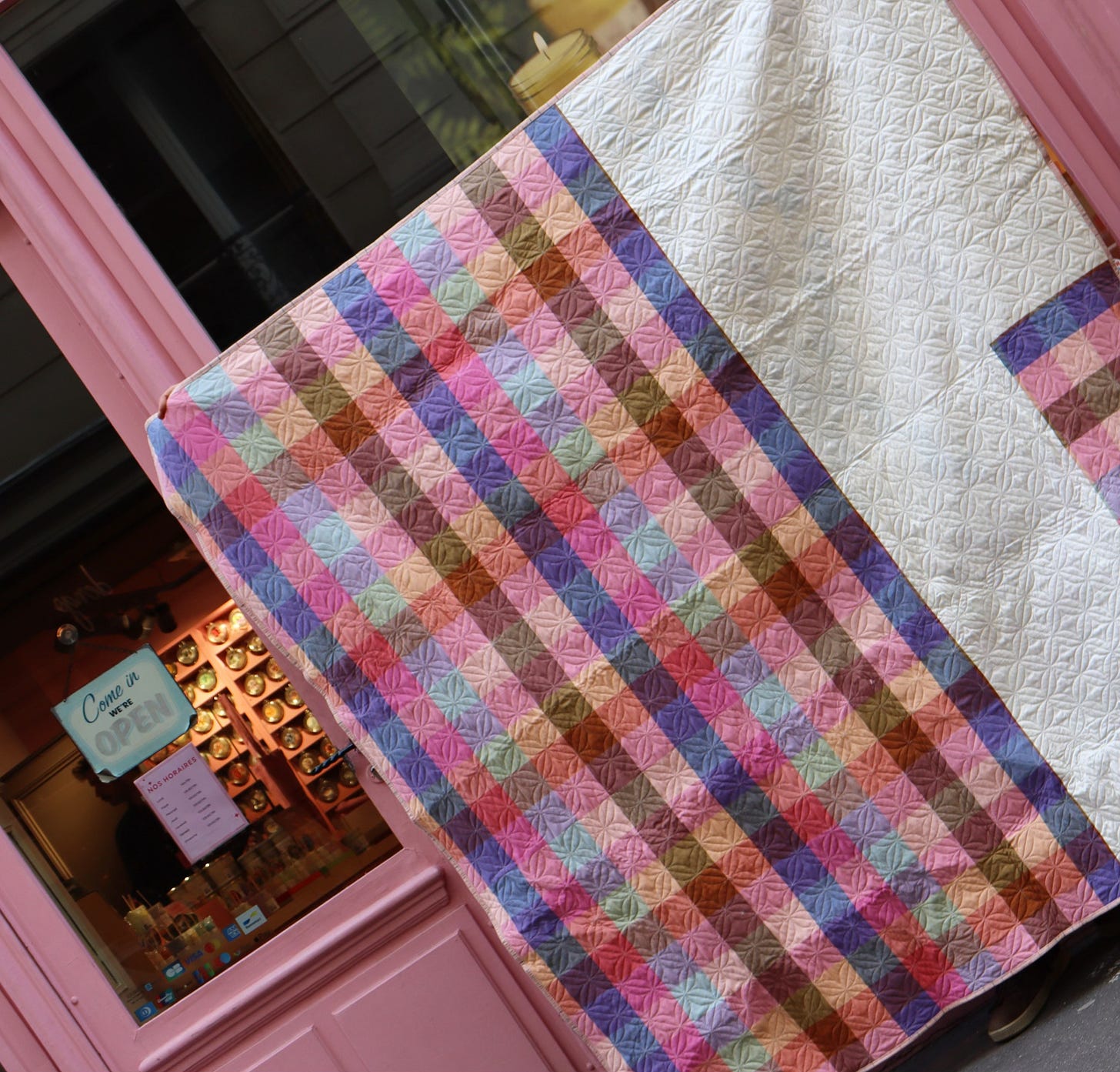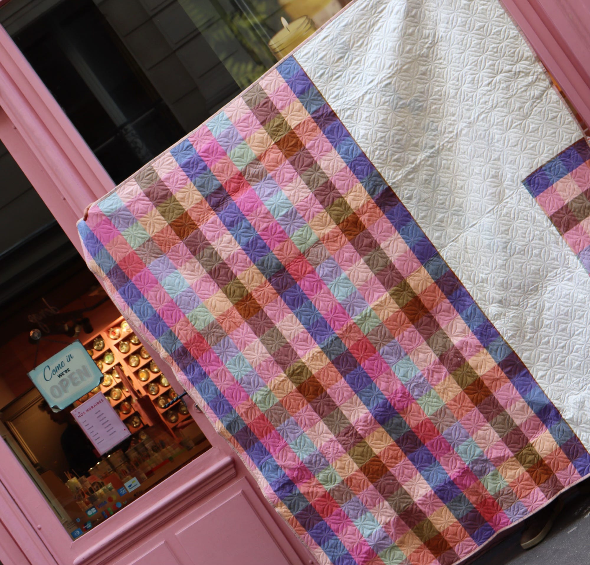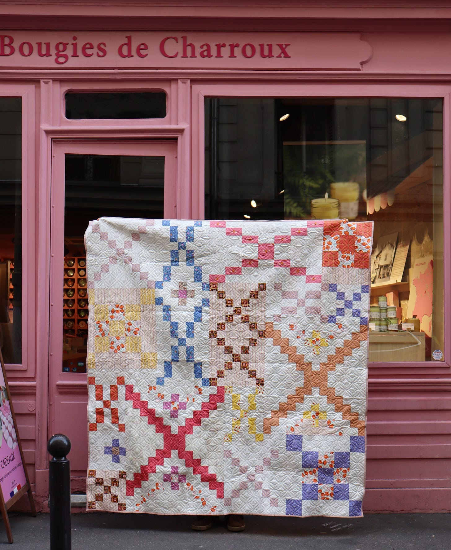 So, you can imagine my delight to find this sweet pink Paris storefront for my photoshoot! It’s a candle shop where the wares are displayed like delectable treats - exactly the right mood for my Trellis Candy quilt.