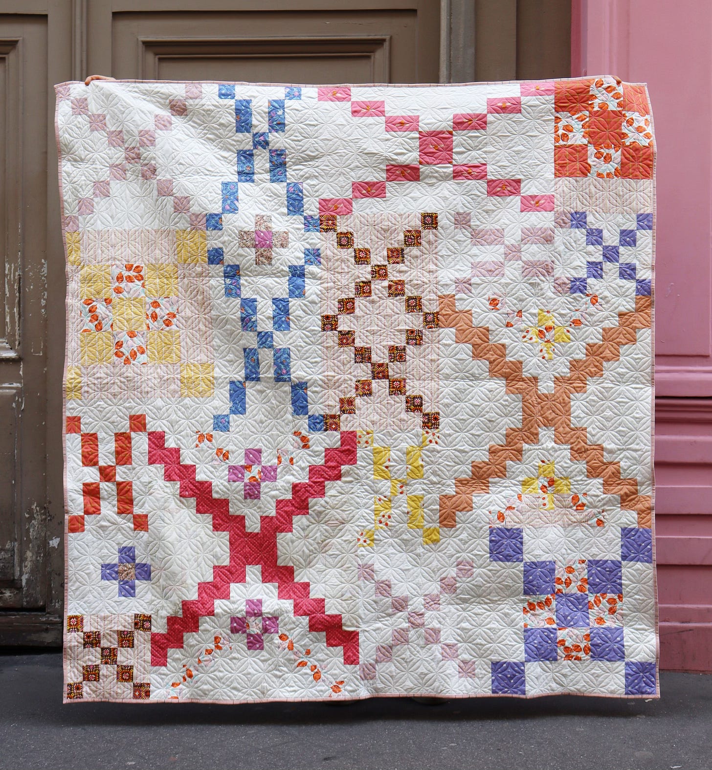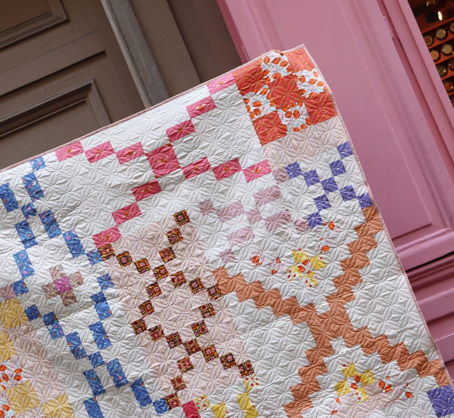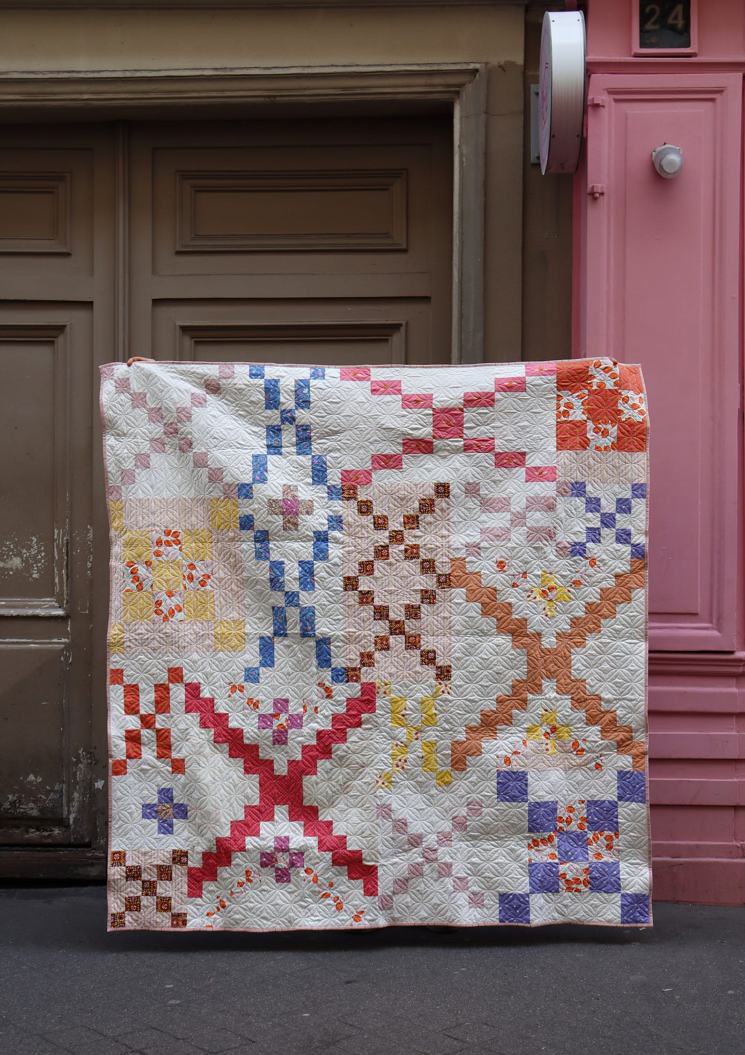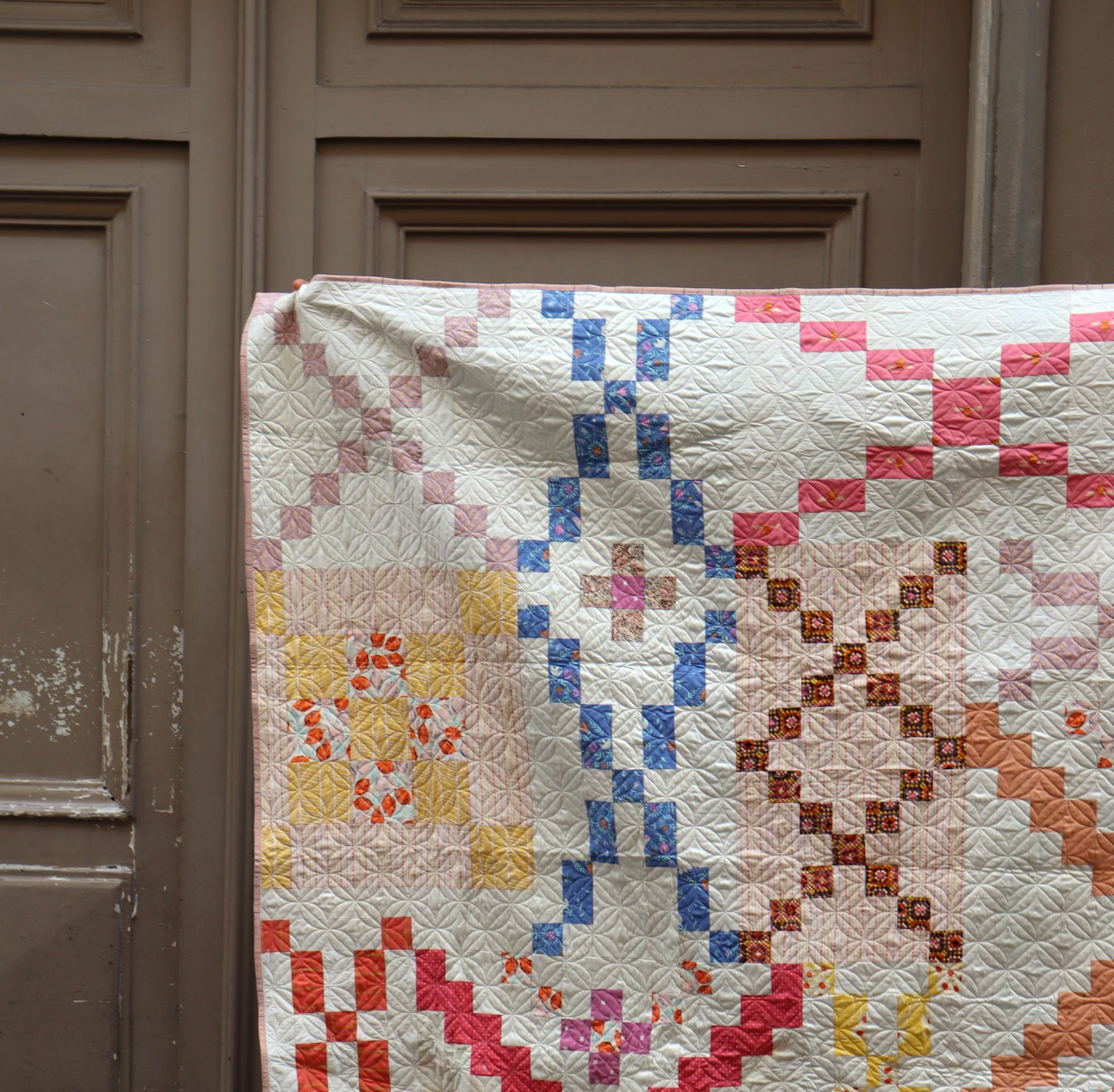 And next door these stately, faded taupe brown doors, also offer a cozy backdrop for my project. With its touches of faded lavender, hazy peach and warm brown, my quilt feels right at home amongst neutrals as well.