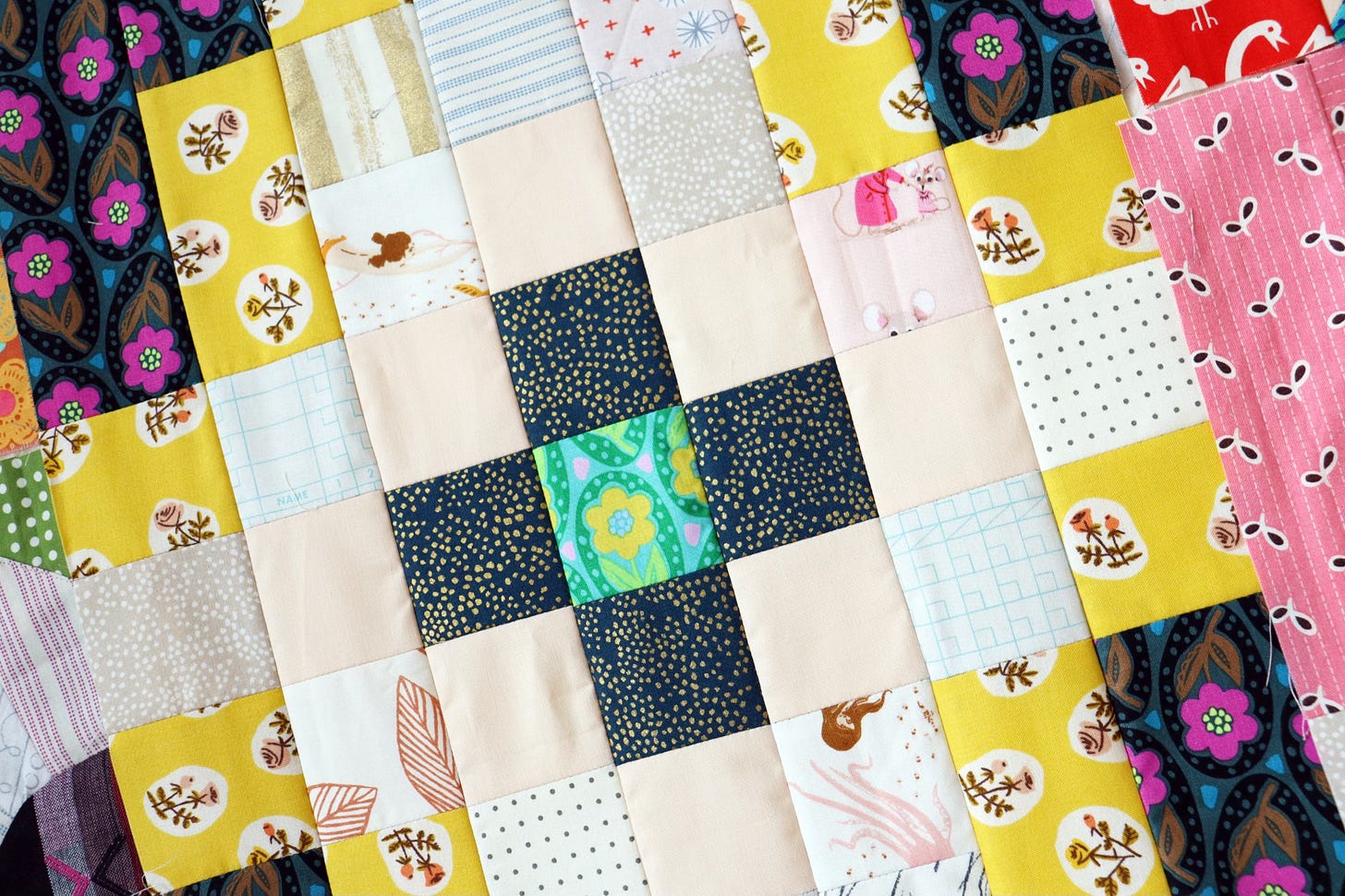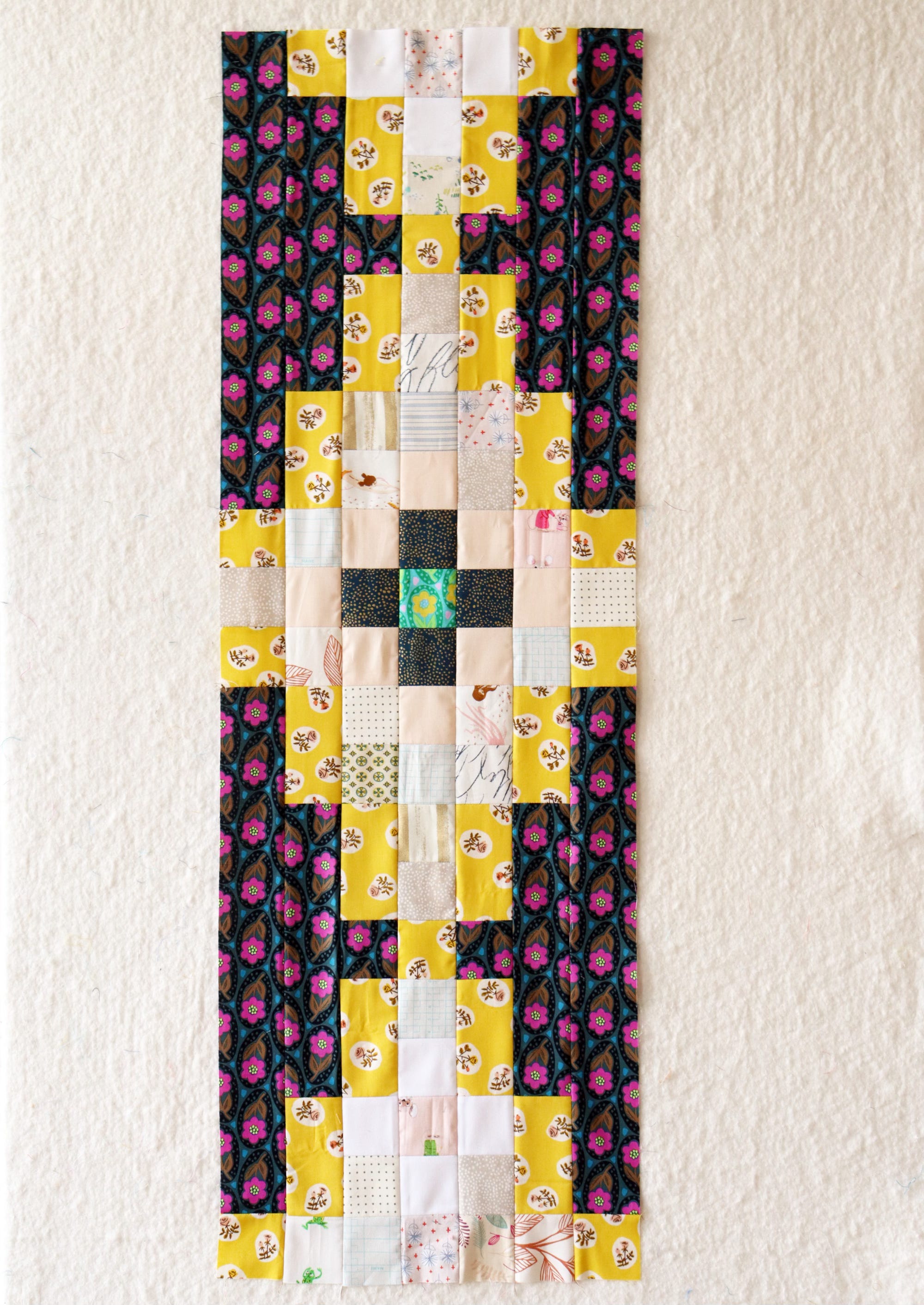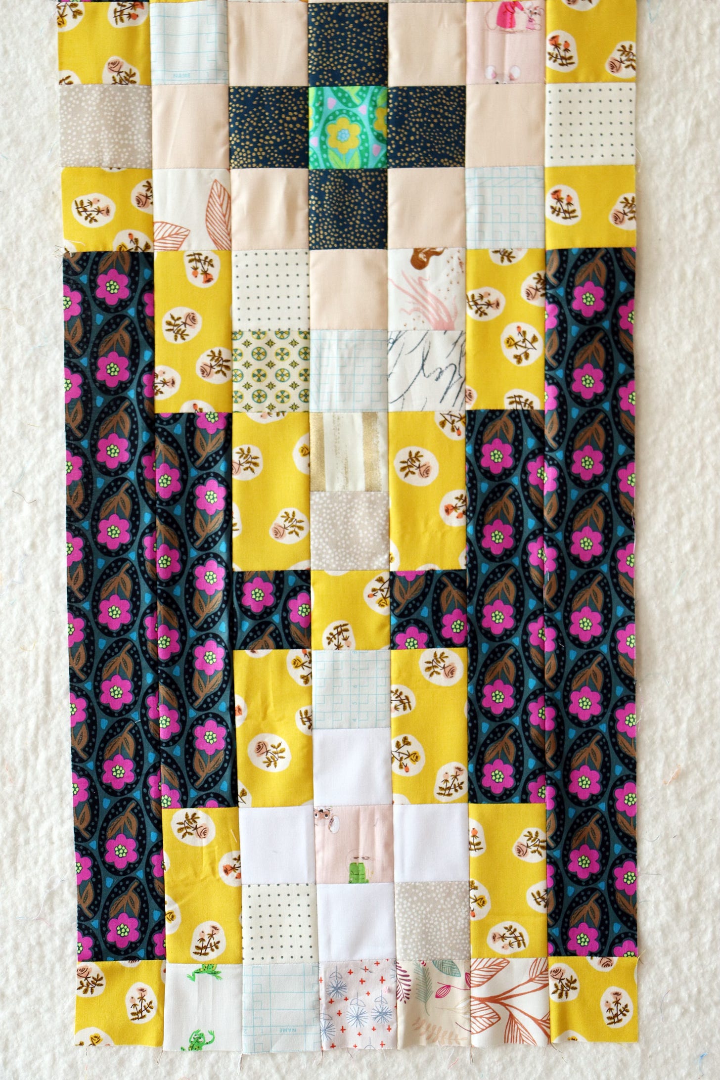 With this group I am using one consistent dark value fabric (black/pink) and a consistent medium value fabric (yellow). Opting for repetition instead of using misc. fabrics makes the patterns in this group visually stronger and more restful. A fun, scrappy quilt does sometimes need moments of rest!