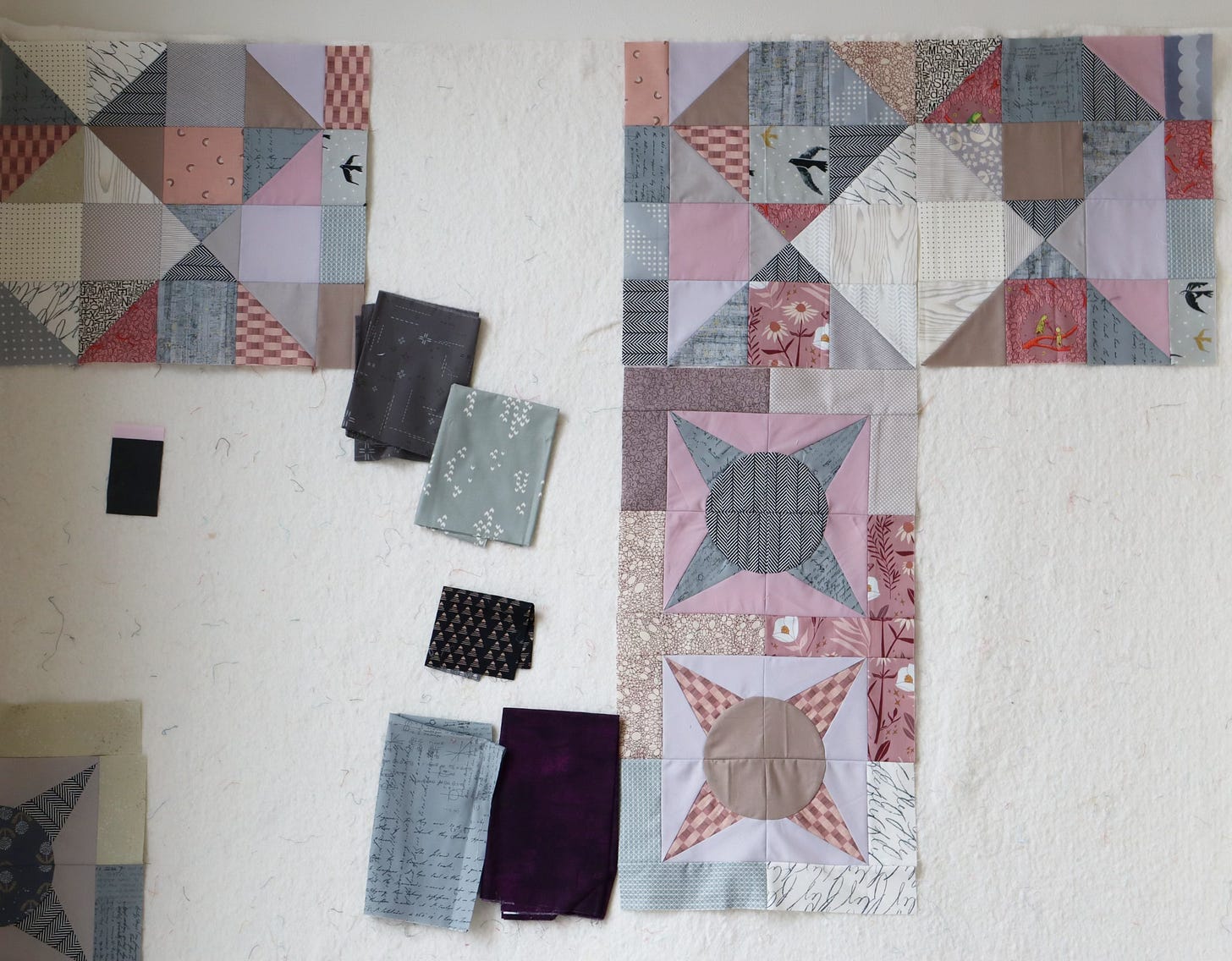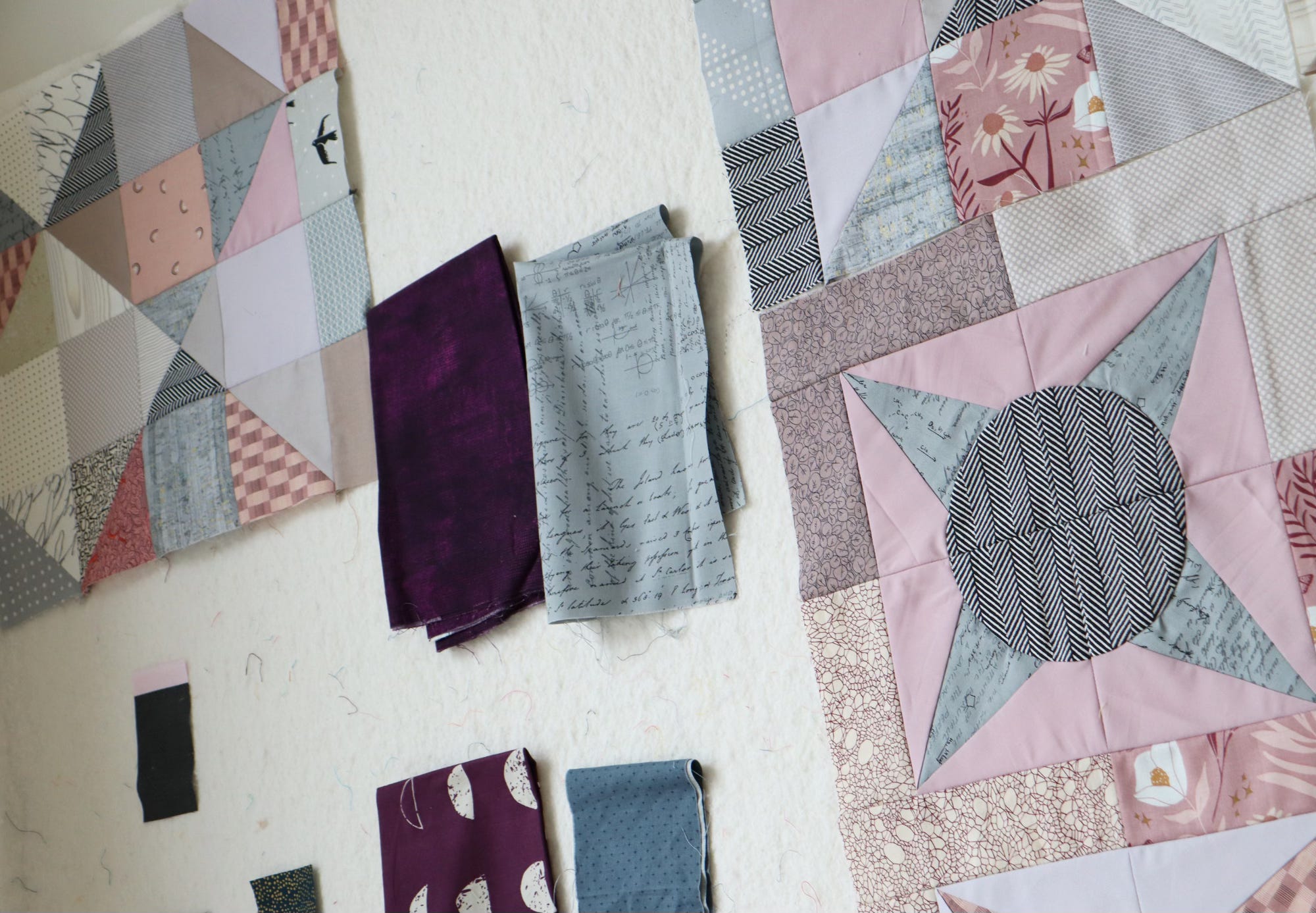 That photo helps me see that the purple print actually feels too dark in the context of my existing patchwork. Too dark can bring too much contrast, rather than a feeling of cohesion.