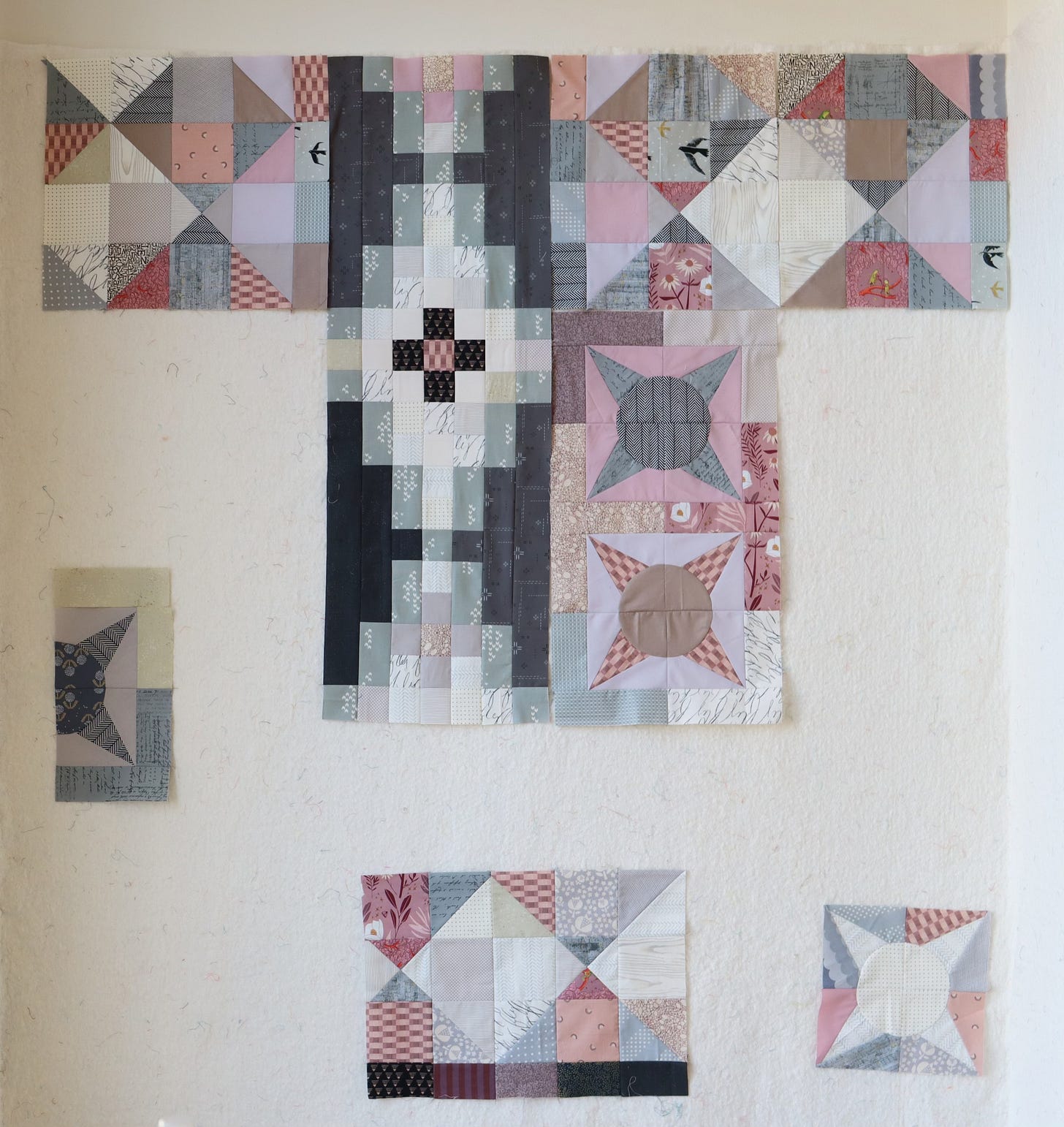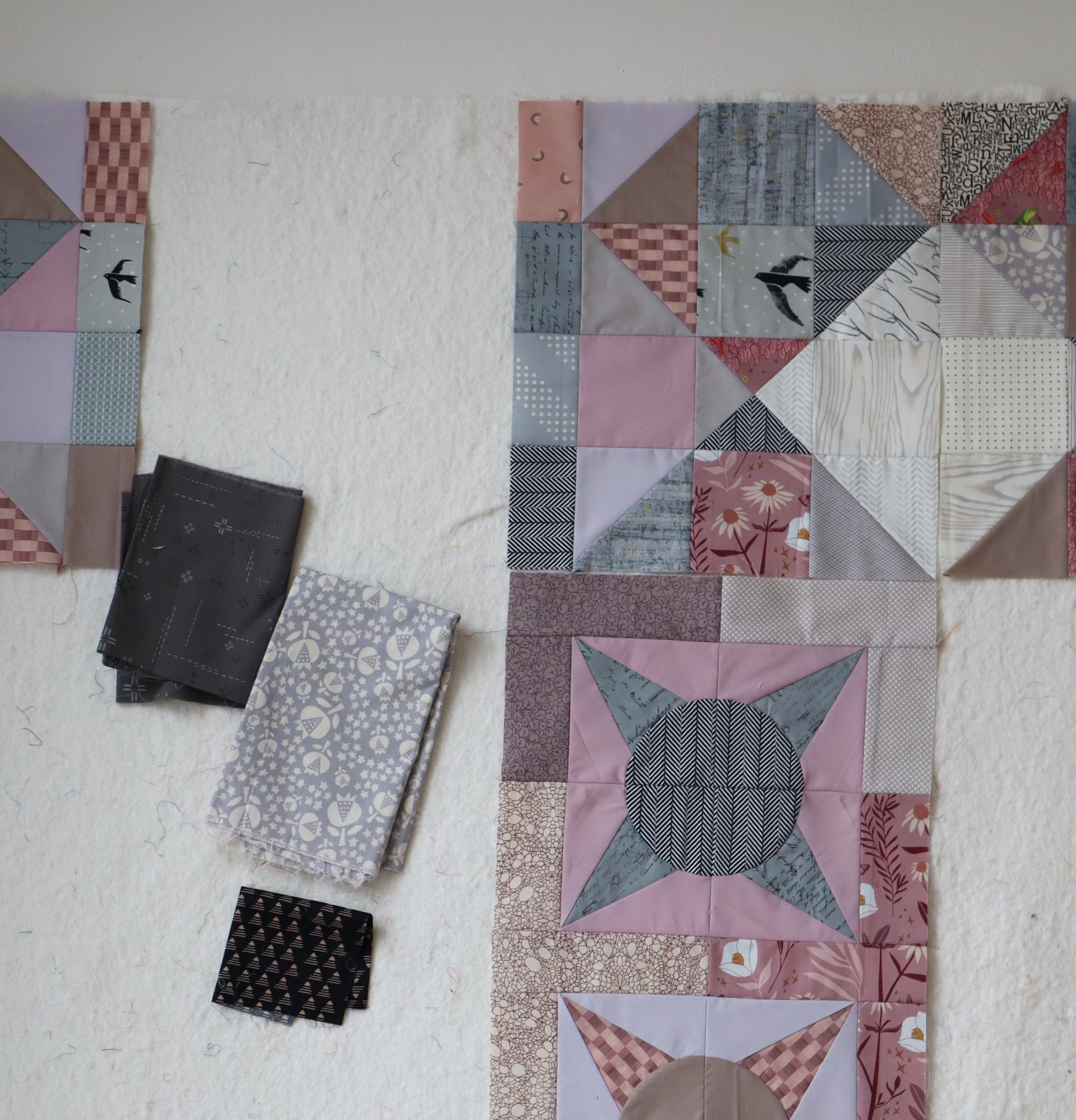 Once fabrics are chosen, I cut all the pieces and arrange them on my design all. Yup, I like!