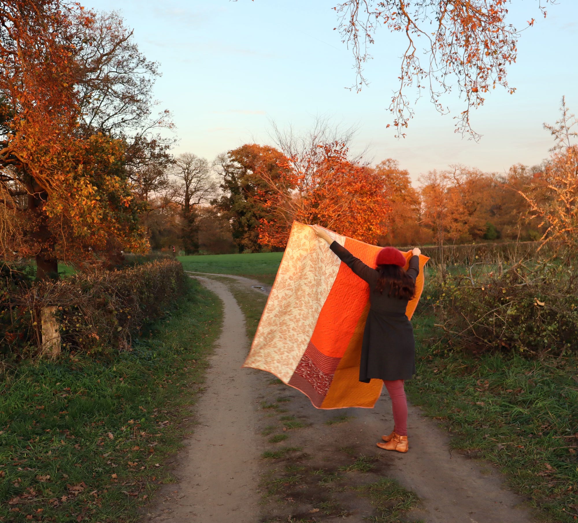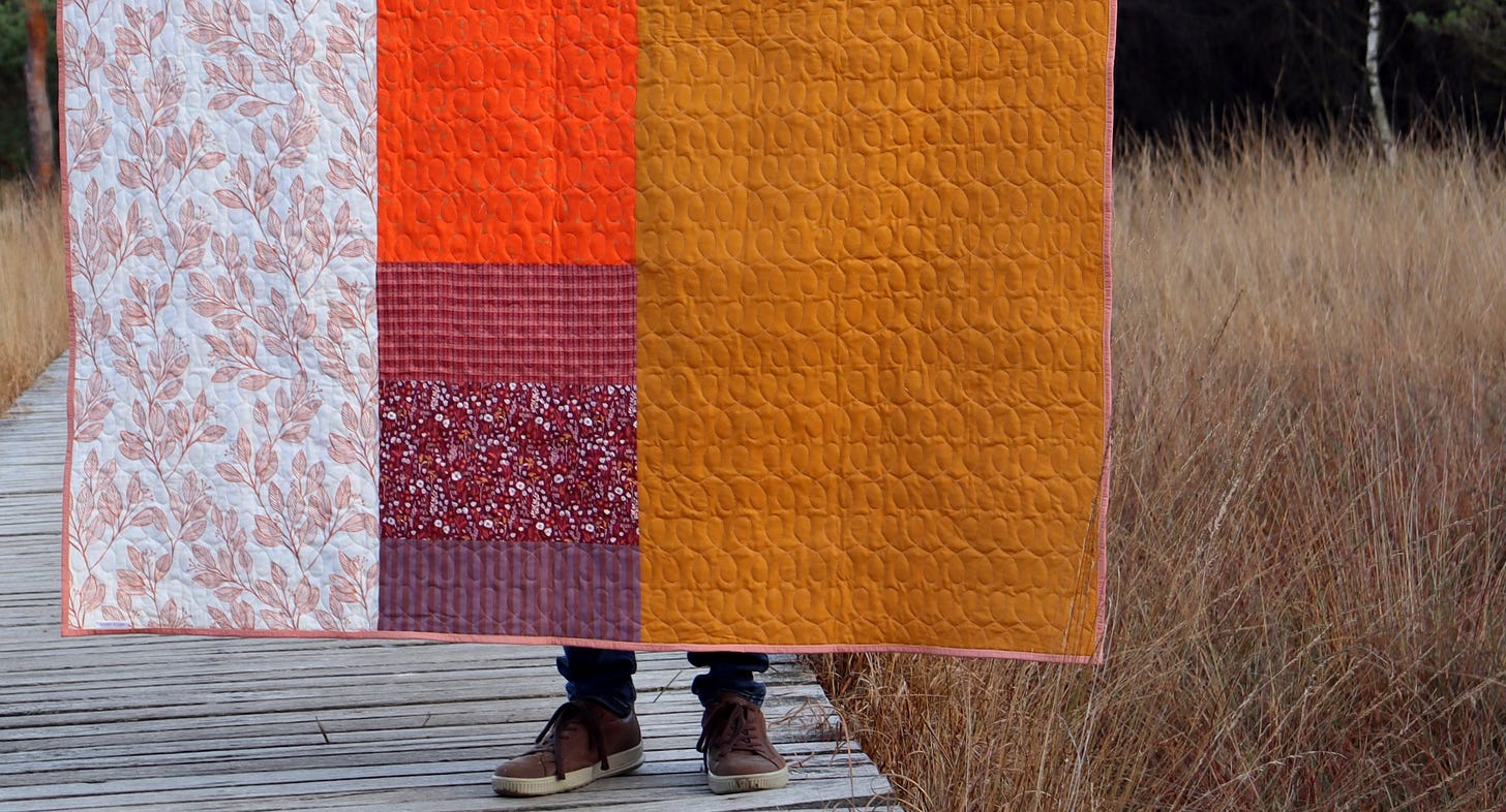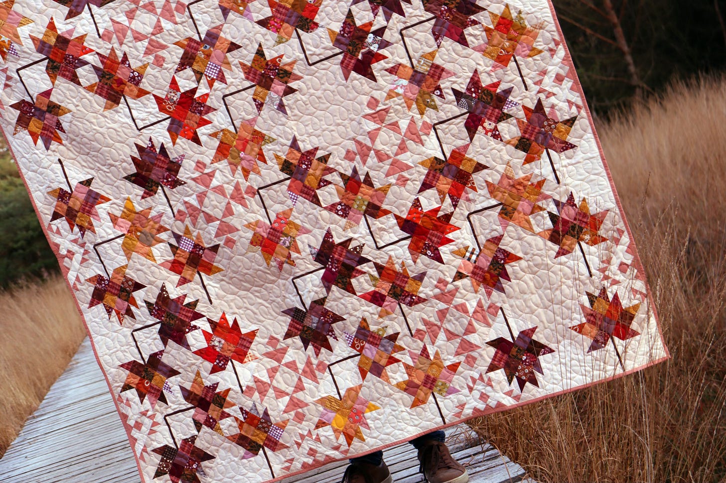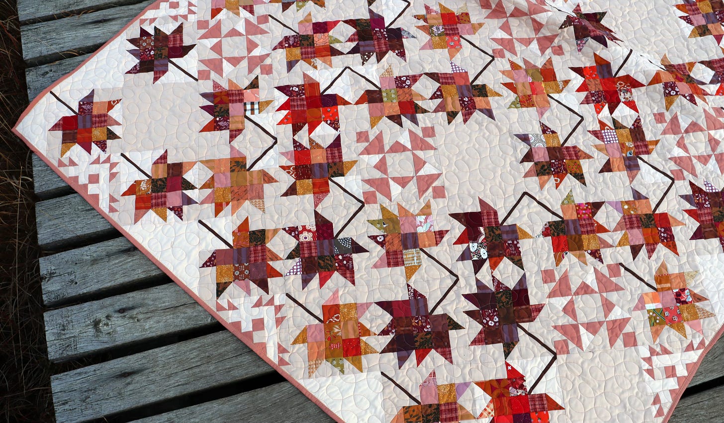 For the quilting I used continuous eight again. It’s sweet, rounded shapes soften all these fancy points. For binding I used Art Gallery Cinnamon - same as for the Sunlight and Breeze blocks. These simple fabric choices give the quilt a restful, warm background, so that the leaves themselves become the story.